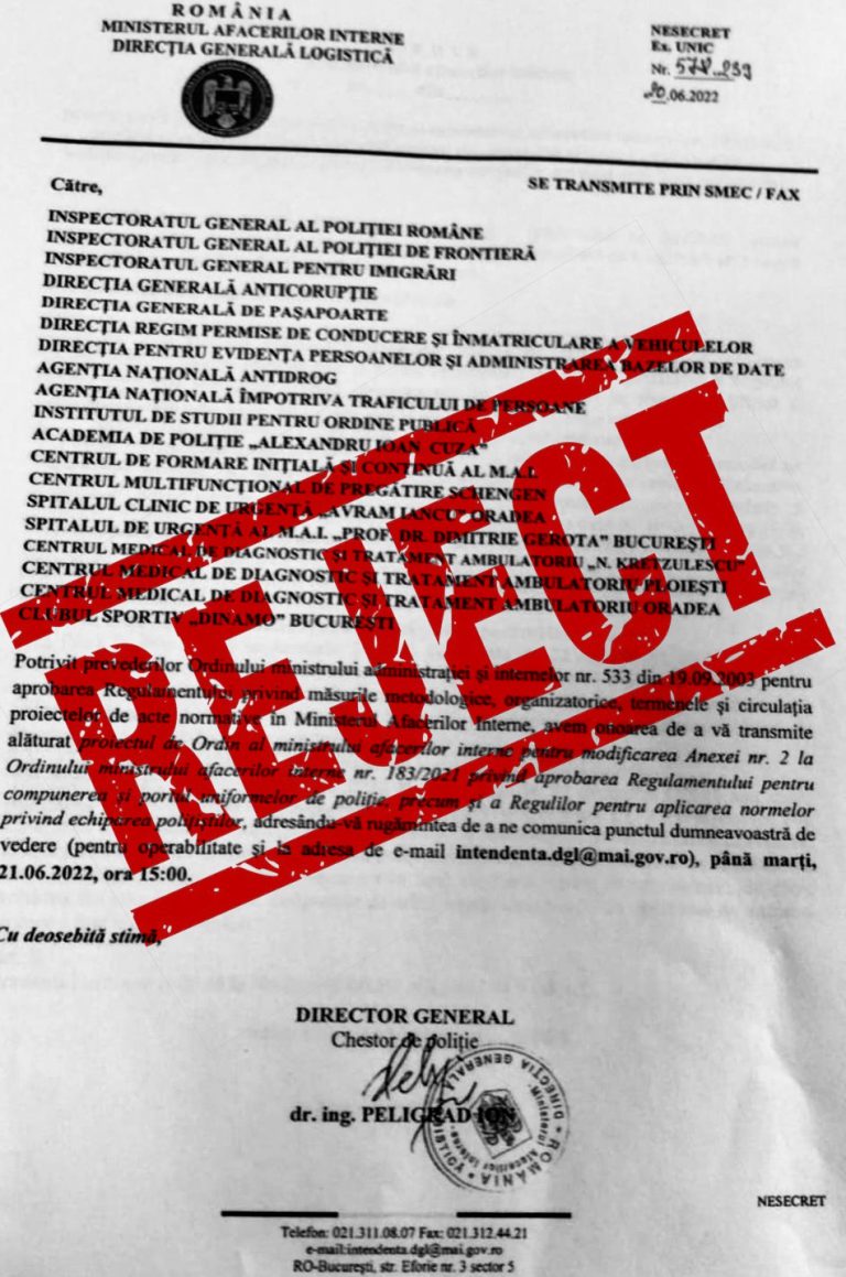 Sindicatul EUROPOL a formulat o solicitare de bun simț la începutul lunii mai 2022, prin care solicita ministrului Lucian Bode să proroge termenul de sistare a acordării normei de echipament până la momentul în care se va achiziționa noua uniformă și va fi distribuită polițiștilor. În răspunsul primit la această solicitare, Direcția Generală Logistică enumera cronologia licitațiilor organizate, din care rezulta faptul că deși întârzierile achizițiilor sunt foarte mari, în continuare erau hotărâți să sisteze plata de la 1 iulie 2022. Ulterior acesta a revenit asupra solicitării într-o ultimă încercare de a-i determina să înțeleagă faptul că de la 1 iulie polițiștii nu vor primi nici norma financiară de echipament, nu vor mai avea acces nici la stocurile vechii uniforme și nici nu vor putea să îmbrace noua uniformă. Asta însemna ca o parte dintre polițiști să fi venit la muncă, parțial în uniformă, parțial în haine civile.