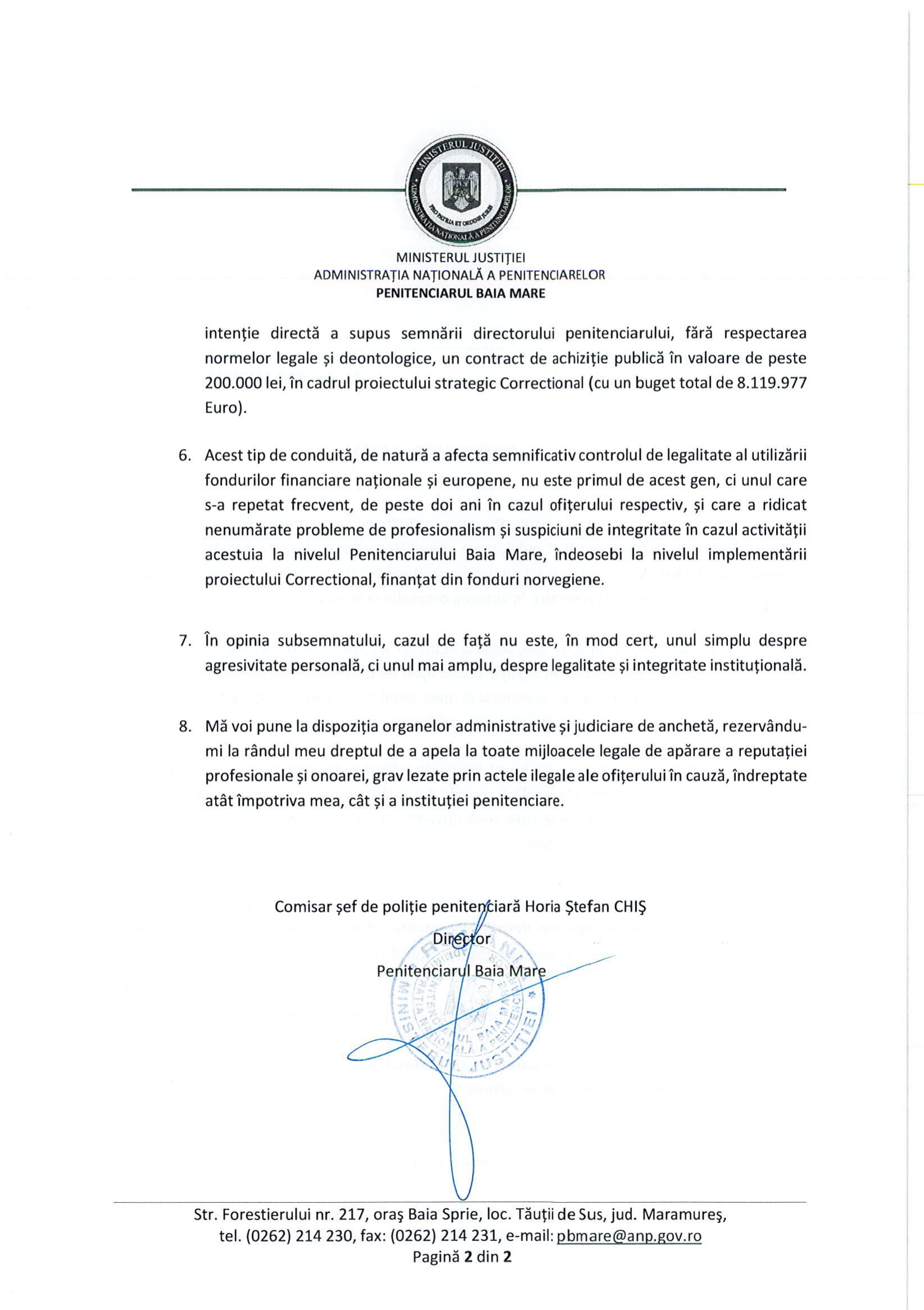 6. Din comunicatul directorului Penitenciarului Baia Mare se observă dorința acestuia de a pune intr-o lumină nefavorabilă propriul angajat, care, in antiteză cu imaginea cea mai pură din intregul sistem penitenciar a domniei sale, să contureze starea de vinovăție, nu a domniei sale, care se duce in zona victimizării, ci a celei care a indraznit să vorbească.