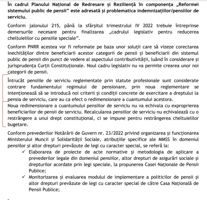 ”Întrucât pensiile de serviciu reglementate prin statute profesionale sunt considerate contrare fundamentului regimului de pensionare, prin noua reglementare se intenționează să se introducă noi criterii și condiții concrete de exercitare a dreptului la pensia de serviciu, care au ca efect o redimensionare a cuantumului acestora”, se spune în Nota de informare privind   adoptarea și implementarea unor măsuri necesare pentru îndeplinirea jalonului 215 aferent reformei sistemului de pensii din cadrul PNRR – indemnizațiile/pensiile de serviciu, inclusiv pensiile militare.