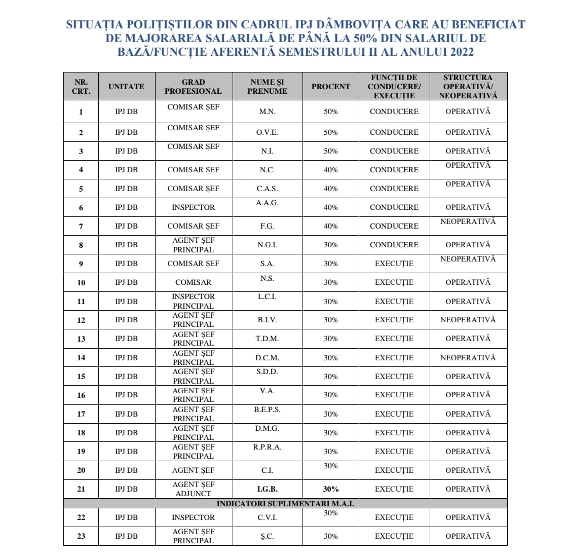 Avem o singură remarcă însă, după cum se poate vede și în lista de mai jos, având în vedere că procentul de 50% a fost alocat deja pentru a doua oară consecutiv ofițerilor cu funcții de conducere, considerăm că ar fi cazul ca la începutul anului 2023, măcar unul din aceste procente să fie repartizat agenților de poliție al căror salariu de bază este mai mic decât al ofițerilor de poliție.