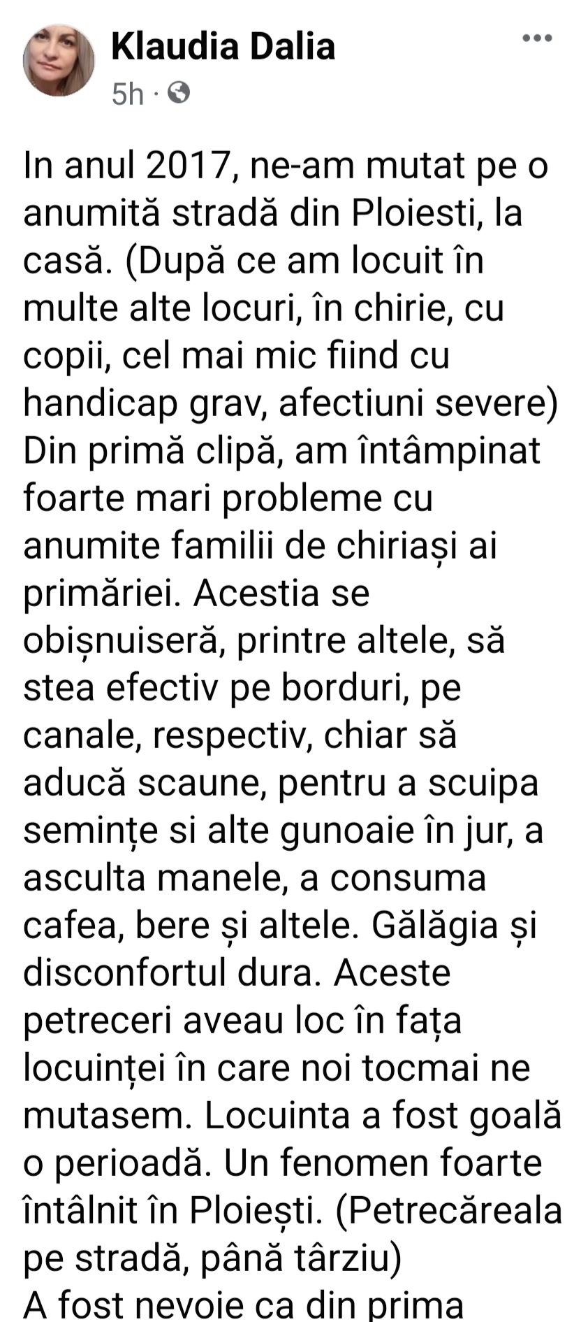 „In anul 2017, ne-am mutat pe o anumită stradă din Ploiesti, la casă. (După ce am locuit în multe alte locuri, în chirie, cu copii, cel mai mic fiind cu handicap grav, afectiuni severe)