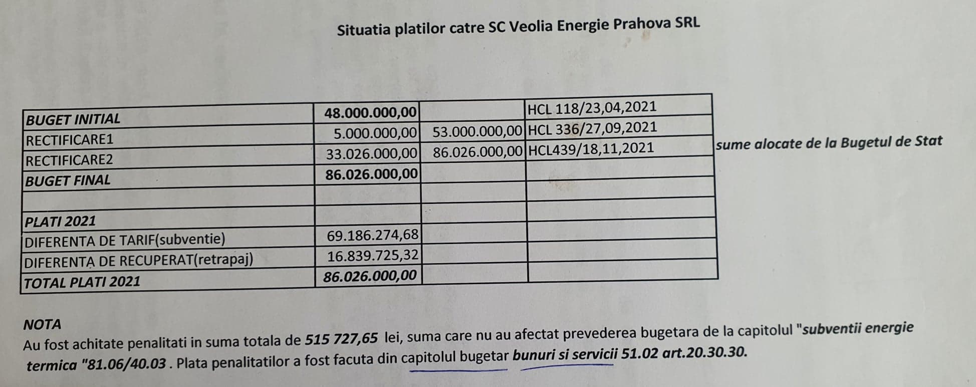 Primăria Ploiești a fost notificată de Veolia Energie Prahova că are de plătit o sumă restantă de 264 de milioane de lei din contractul de termie care a fost reziliat în primăvară. Suma este uriașă și nu poate fi suportată din bugetul local.