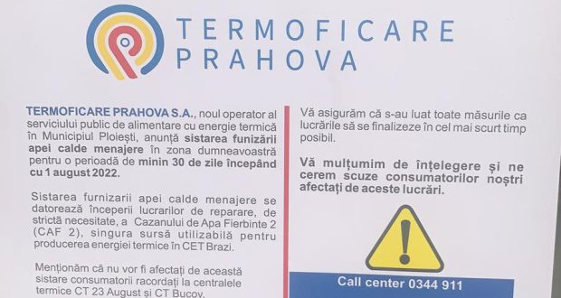 Veste incredibilă pentru ploieşteni în plină pandemie si caniculă. Noul operator de termie anunţă oprirea furnizării apei calde în anumite zone din municipiul Ploieşti pentru o perioadă de …minim 30 de zile. Motivul oficial: lucrări de reparaţii ale Cazanului de Apă Fierbinte, singura sursă de energie termică de la CET Brazi.