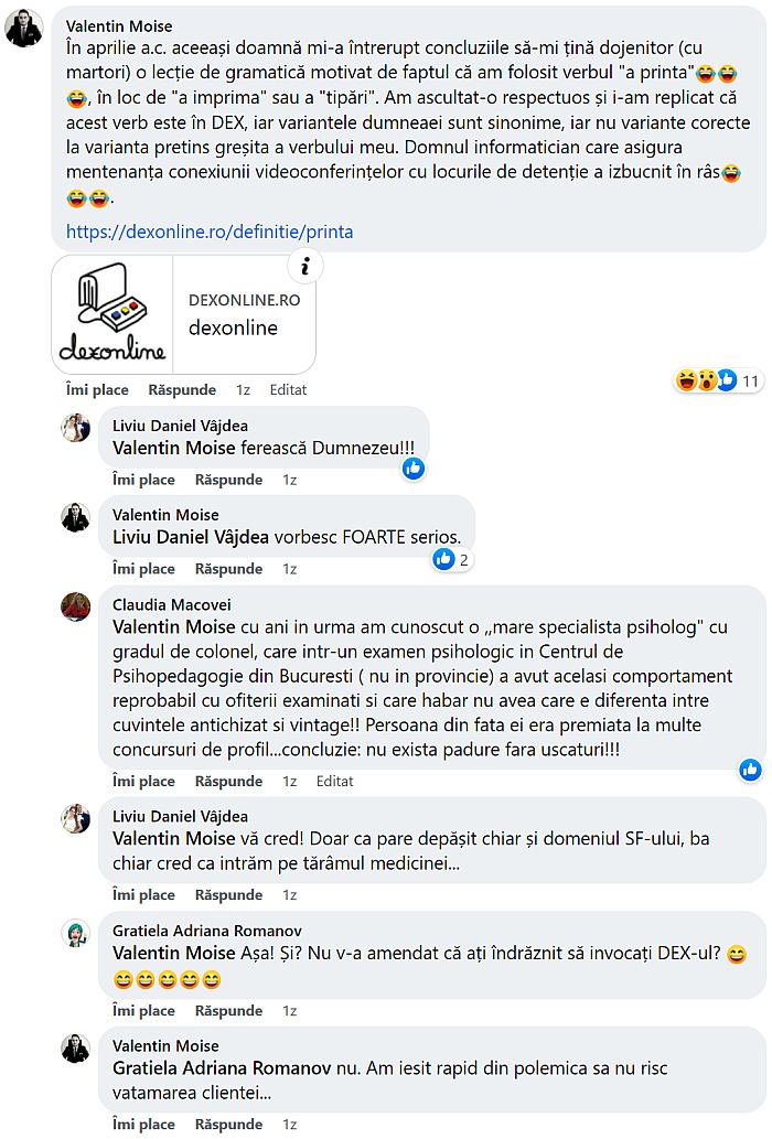 „In aprilie a.c. aceeasi doamna mi-a intrerupt concluziile sa-mi tina dojenitor (cu martori) o lectie de gramatica motivat de faptul ca am folosit verbul ‘a printa’, in loc de ‘a imprima’ sau a ‘tipari’. Am ascultat-o respectuos si i-am replicat ca acest verb este in DEX, iar variantele dumneaei sunt sinonime, iar nu variante corecte la varianta pretins gresita a verbului meu. Domnul informatician care asigura mentenanta conexiunii videoconferintelor cu locurile de detentie a izbucnit in ras”.