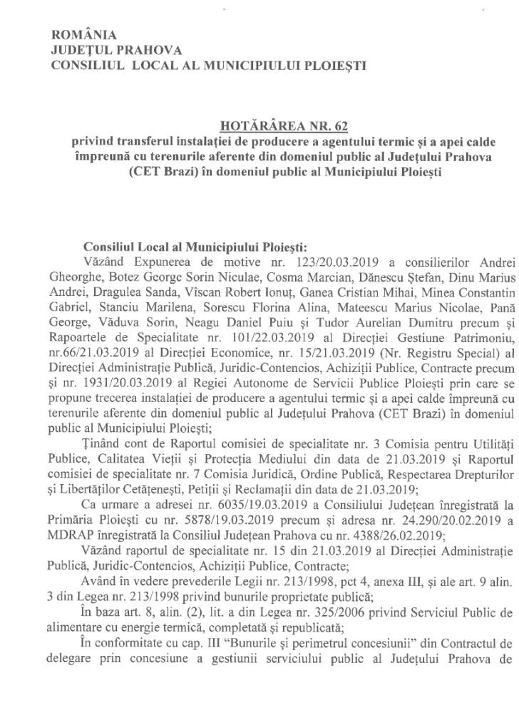 Problema furnizării apei calde în municipiul Ploieşti nu ar fi existat dacă o hotărâre din anul 2019 ar fi fost pusă în practică. Vorbim despre HCL 62/ 2019 – privind transferul instalaţiei de producere a agentului termic şi a apei calde şi a terenurilor aferente din domeniul Judeţului Prahova în domeniul public al Municipiului Ploieşti!