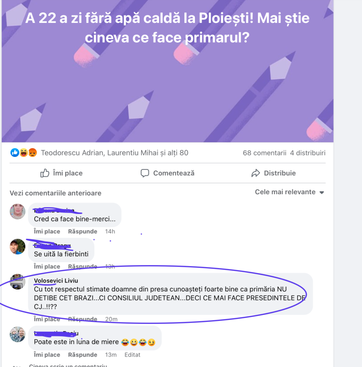 Ploieştenii nu au de 23 de zile apă caldă, iar situaţia s-ar putea prelungi cel puţin încă o lună. În acest timp, primarul Andrei Volosevici are timp să comenteze pe reţeaua de socializare Facebook, încercând în stilul caracteristic să dea vina pe oricine altcineva.