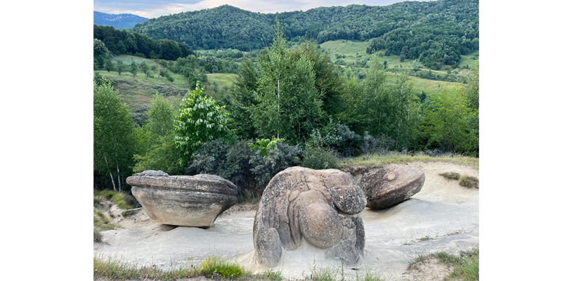 În final, ne-au plăcut ambele versiuni de povești ale apariției vulcanilor și, după o scurtă plimbare pe dealurile din împrejurimi, acoperite de pământ uscat și de vegetație specifică acestei zone atât de aride, ne-am continuat drumeția spre un alt loc încărcat de mituri si legende, unde ne-am bucurat de mai multă liniște, de umbră și de o priveliște a Subcarpaților Buzăului.