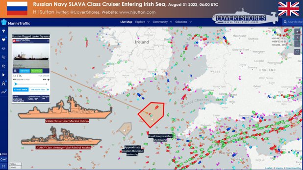 Crucişătorul din clasa Slava, mareşal Ustinov, distrugătorul Viceamiral Kulakov, din clasa Udaloy, şi o navă logistică pentru reaprovizionare, Vyazma, urmează să treacă prin apele teritoriale britanice, prin Canalul Nordic (Strâmtoarea dintre Marea Britanie şi Irlanda), conform analistului militar HI Sutton. În prezent navele se apropie de Marea Irlandei.