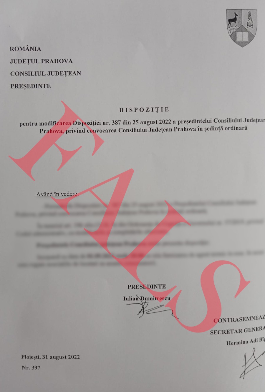 În urma apariţiei în spaţiul public al unui înscris care conţine, în antet, stema judeţului Prahova, precum şi semnături atribuite preşedintelui Consiliului Judeţean (CJ), Iulian Dumitrescu, şi secretarului general al judeţului Prahova, Hermina Adi Bîgiu, precizăm că este un FALS.