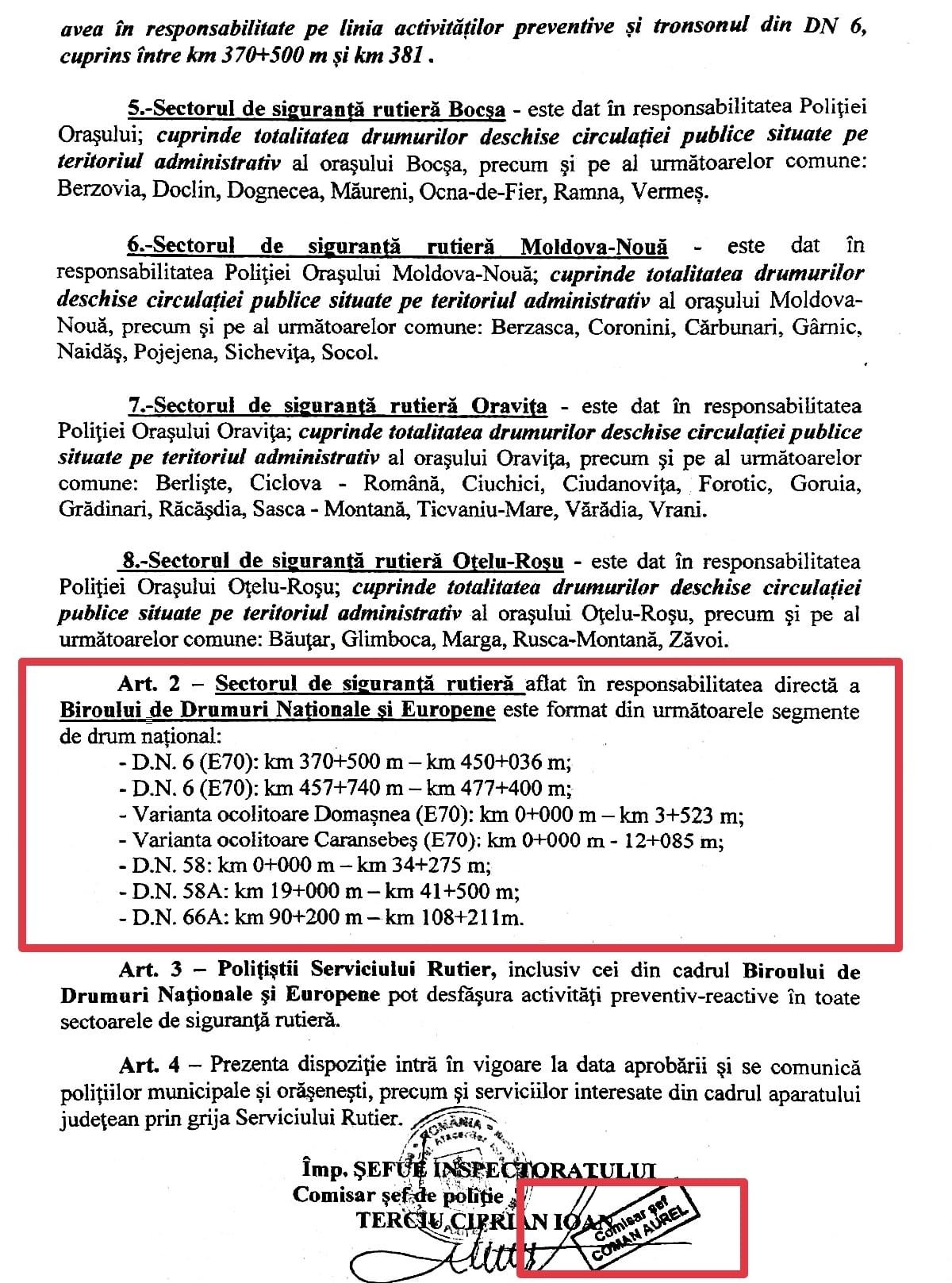 Comisar șef Coman Aurel, adj insp. șef, pentru a scăpa de polițiștii incomozi care au deranjat patronii unor firme ”preferențiale” și diverși oameni politici, profitând de Dispoziția șefului inspectoratului prin care a decis mutarea sediului BDNE cadrul Poliției Stațiunii Băile Herculane, la Poliția Municipiului Caransebeș (sub pretextul creșterii numărului de accidente rutiere), dar și de faptul că inspectorul șef se afla în concediu, emite Dispoziția cu nr. 525/16.09.2022 prin care împarte teritoriul județului în 8 sectoare de siguranță rutieră. Aparent, nimic în neregulă, însă după ce am analizat unicul motiv care a stat la baza deciziilor sale de schimbarea a sediului, am descoperit următoarele cifre: