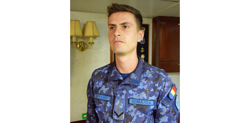 Fruntaşul Cristian Rotaru este mecanic frigotehnist. De aproape trei ani și jumătate face parte din echipajul fregatei Regele Ferdinand. Este din comuna Bărăganu, judeţul Constanţa.