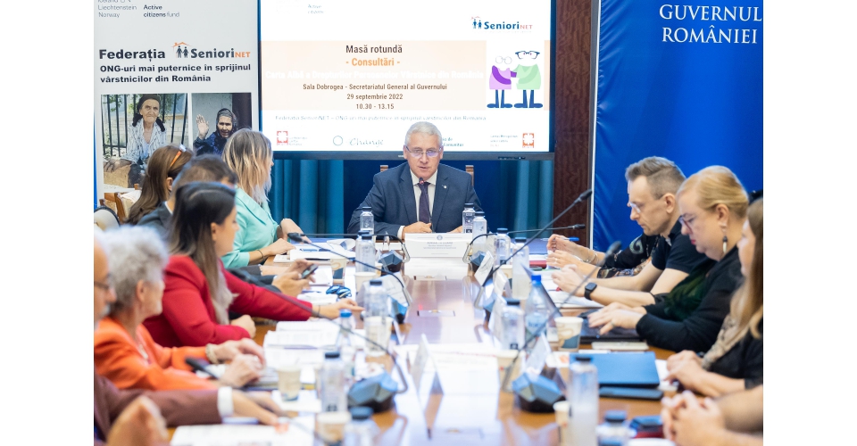 Guvernul, prin Secretariatul General, a găzduit, ieri, la Palatul Victoria, Masa Rotundă de consultări pe marginea Cartei Albe a Drepturilor Persoanelor Vârstnice din România. Documentul a fost pus în dezbatere de către Federația SenioriNET, formată din organizații neguvernamentale furnizoare de servicii socio-medicale adresate persoanelor vârstnice. Evenimentul a fost organizat în perspectiva Zilei Internaționale a Persoanelor Vârstnice, celebrată la data de 1 octombrie.
