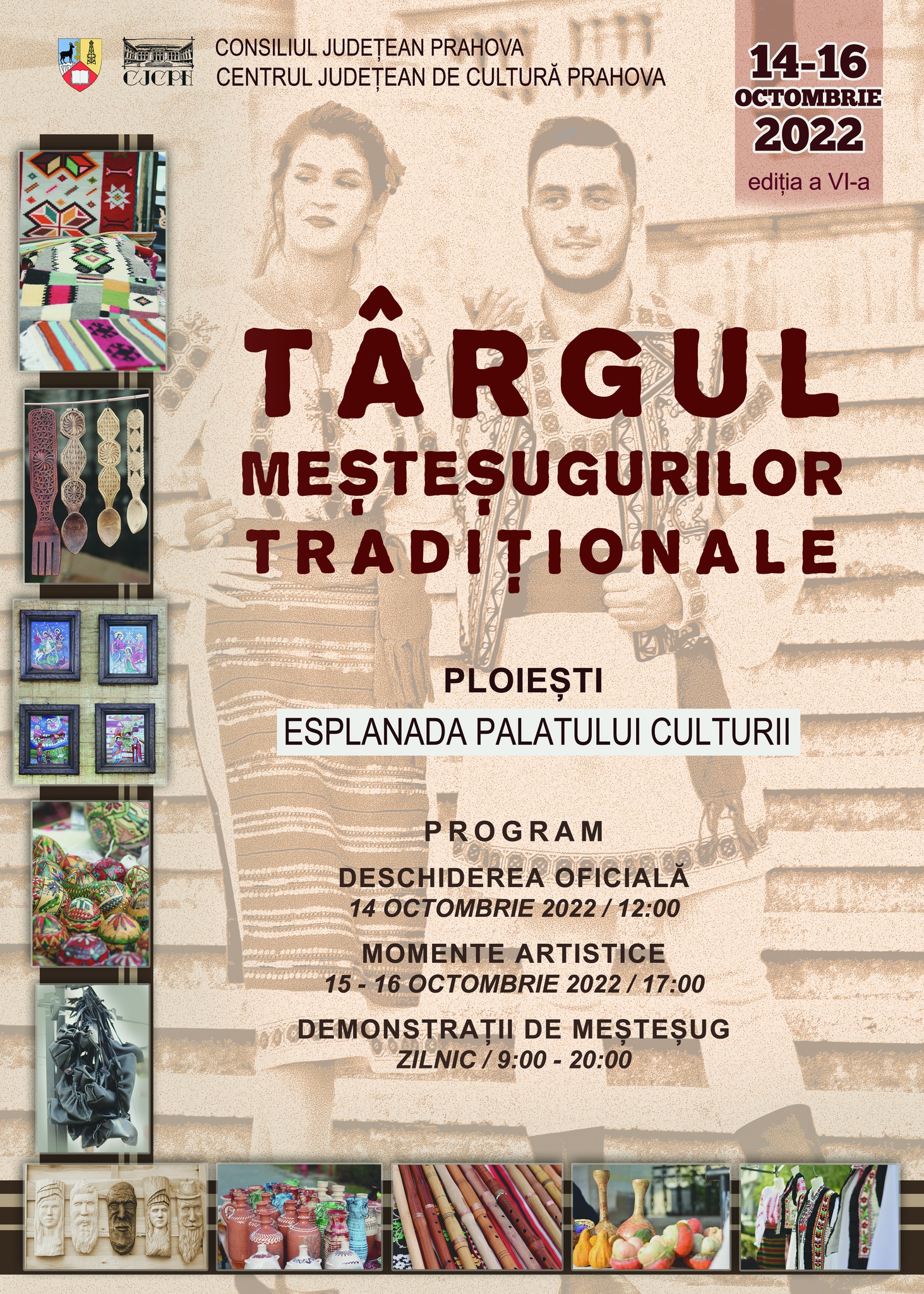 Vă aşteptăm în perioada 14-16 octombrie 2022, în intervalul 9:00-20:00, pe esplanada Palatului Culturii pentru a îi cunoaşte pe meşterii invitaţi!