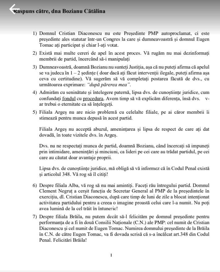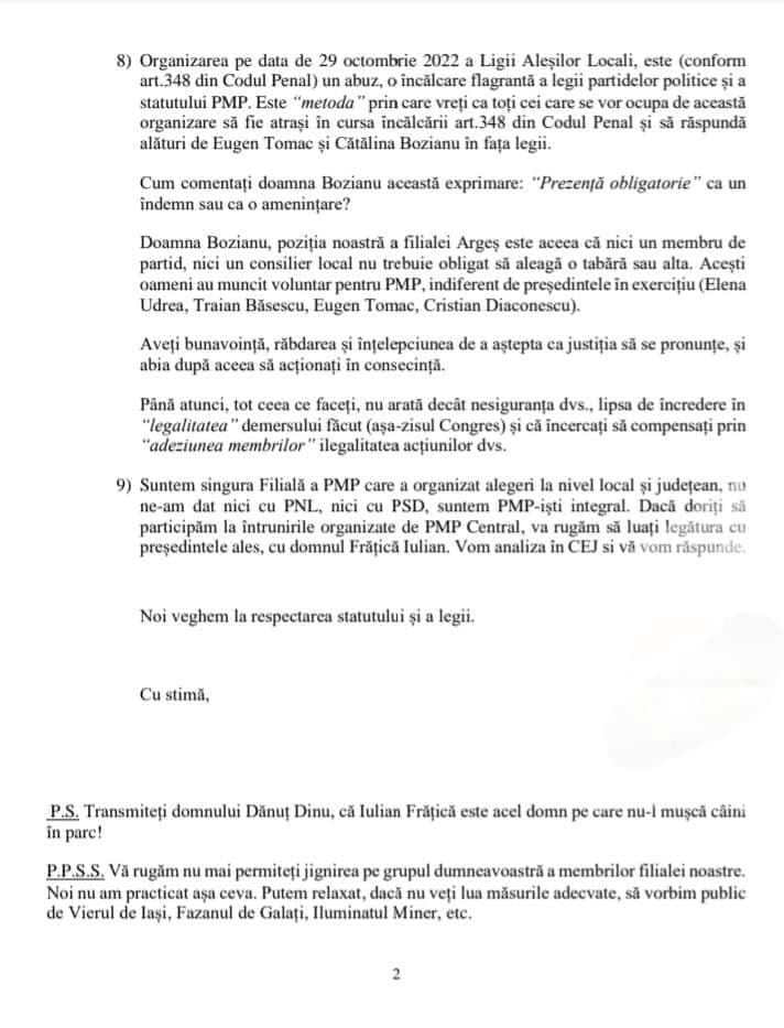 Documente/Filiala PMP Arges ii atrage atentia Catalinei Bozianu (si Europarlamentarului Eugen Tomac) de savarsirea unor posibile infractiuni (art 348 Cod Penal) si dezvaluie intimidari, amenintari si minciuni