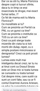 - Sabăreane, gura mică! Ultimul om care ar putea da lecții despre integritate ești tu, cel acuzat de sifonarea banilor publici! (Cristina T.).