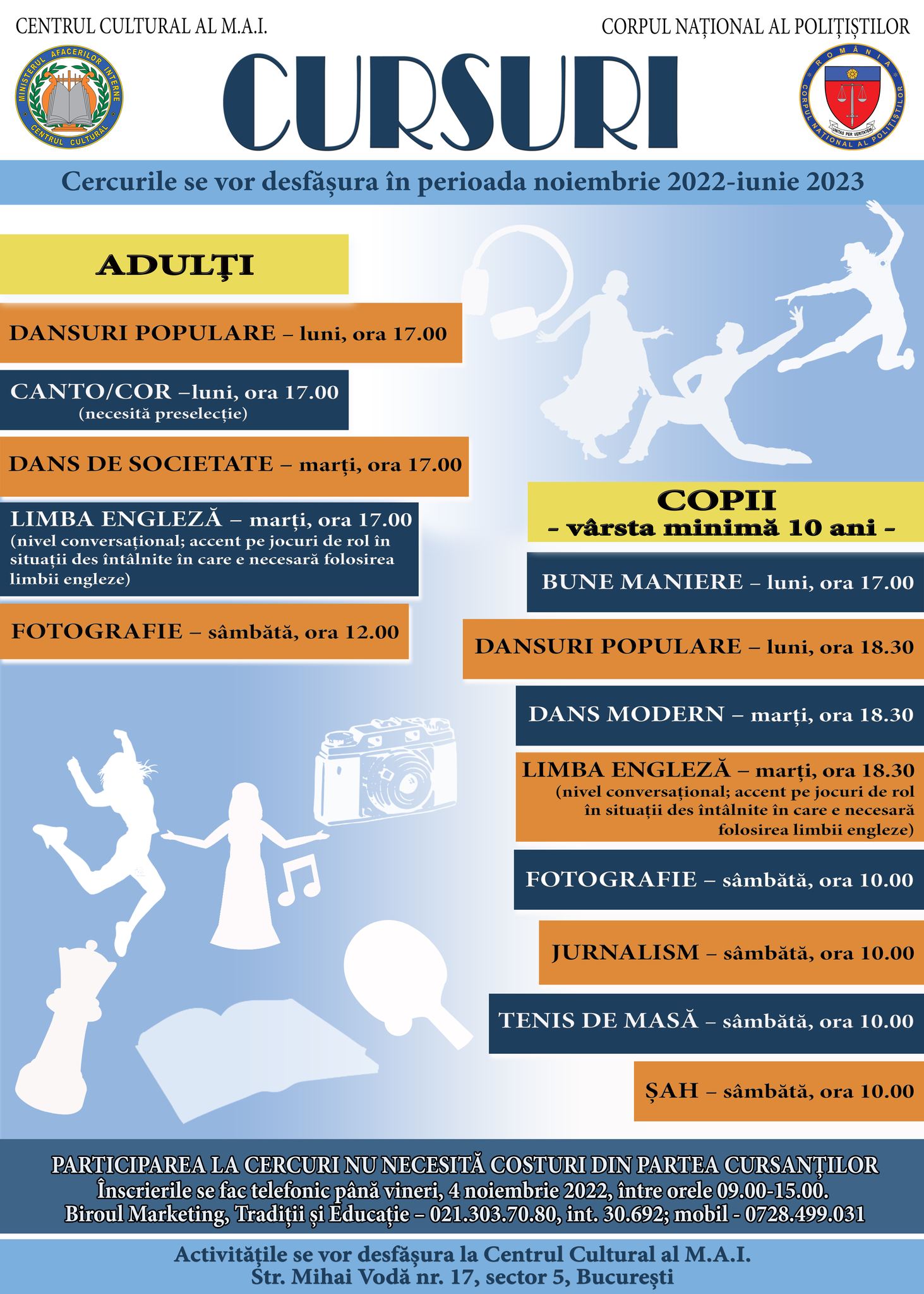 Centrul Cultural al M.A.I., cu sprijinul Corpului Național al Polițiștilor, organizează gratuit, în perioada noiembrie 2022 – iunie 2023, o serie de cercuri dedicate cadrelor și pensionarilor M.A.I., precum și copiilor / rudelor de gradele 2,3 ale acestora
