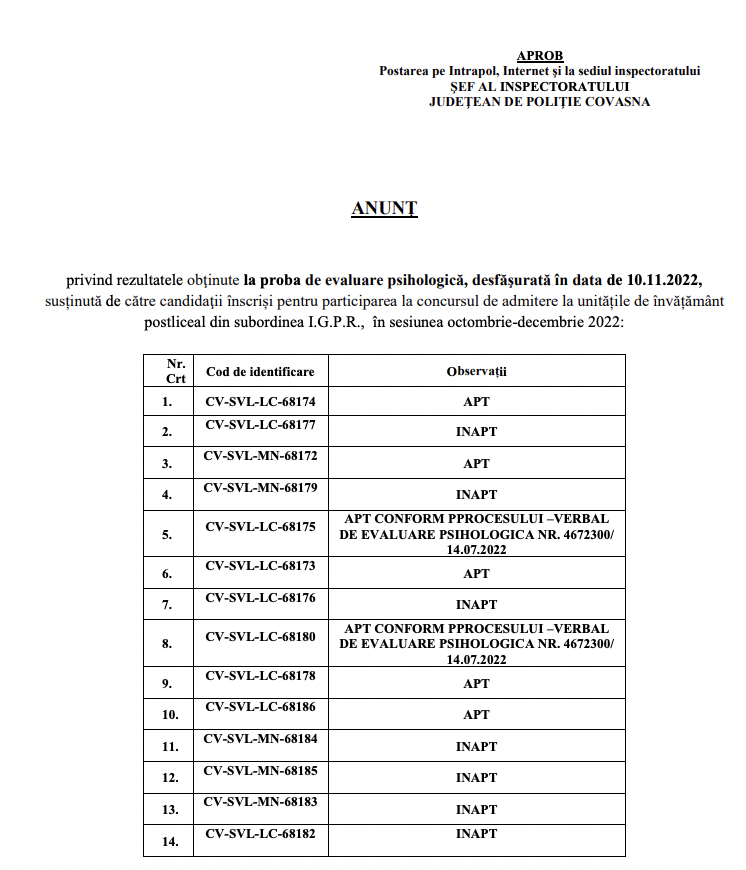 După ce v-am prezentat cifrele finale referitoare la numărul de candidați înscriși la procesul de admitere în școlile de poliție, care este cel mai scăzut din istoria MAI, fiind vorba despre aproximativ 5000 de candidați la 1640 locuri disponibile în Școala de agenți de poliție de la Câmpina și Cluj Napoca, revenim cu cifrele în urma parcurgerii primei probe eliminatorii, respectiv testarea psihologică, precizeaza cei de la sindicatul Europol.