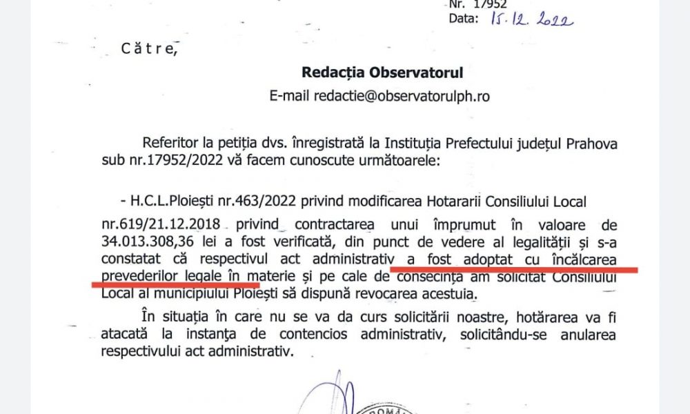 Prefectura Prahova confirmă una dintre cele mai proaste vești pe care le puteau primi ploieștenii în actualul context, în care orașul a fost împins în pragul falimentului. Contracte pe fonduri europene în valoare de 331.244.490,96 de lei au sunt pe punctul de a fi pierdute ca urmare a comportamentului manipulator, iresponsabil și abuziv al primarului … Continuă lectura Prefectura Prahova si ziarul indepentent Observatorul Prahovean (nu cele din „oficios”) confirmă dezvaluirile ziarului Incisiv de Prahova