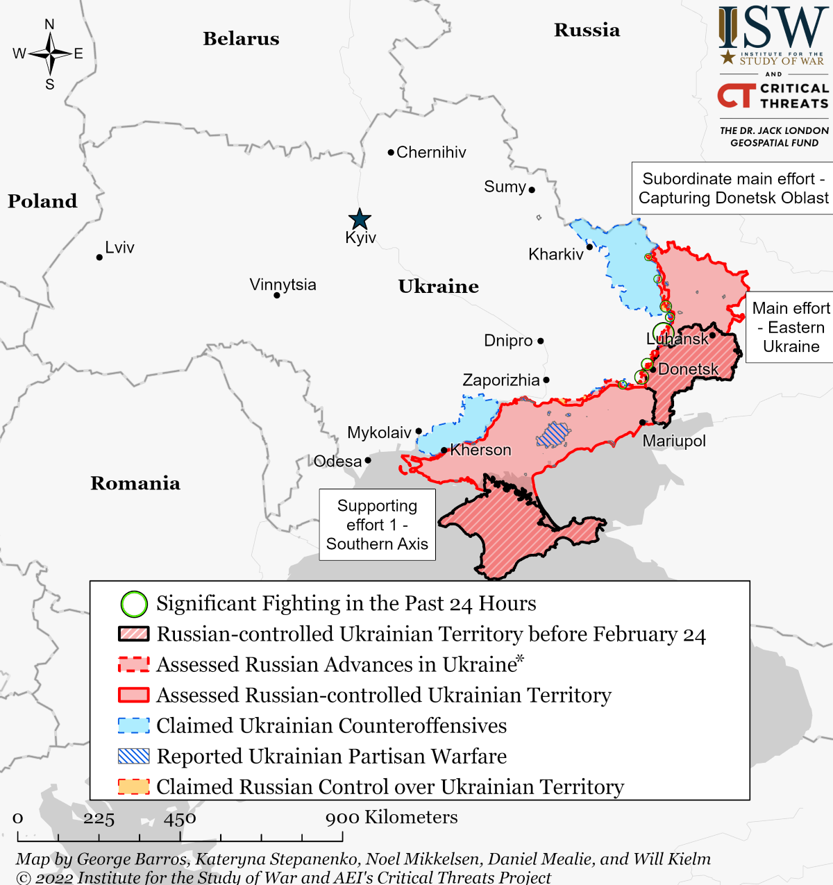 Au urmat luni cu lupte intense, în care rezistența ucraineană a uimit întreaga lume. Tot mai multe state NATO au început să furnizeze armament occidental și sovietic Kievului, SUA fiind campionul net al acestui efort susținut.