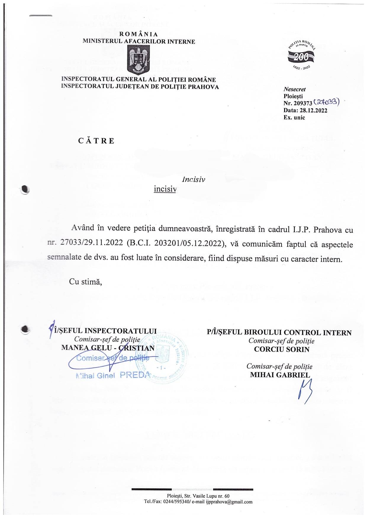 Prin raspunsul emis de institutia in cauza (209373/28.12.2022) am fost informati ca “aspectele semnalate de dvs au fost luate in considerare, fiind dispuse masuri cu caracter intern”.