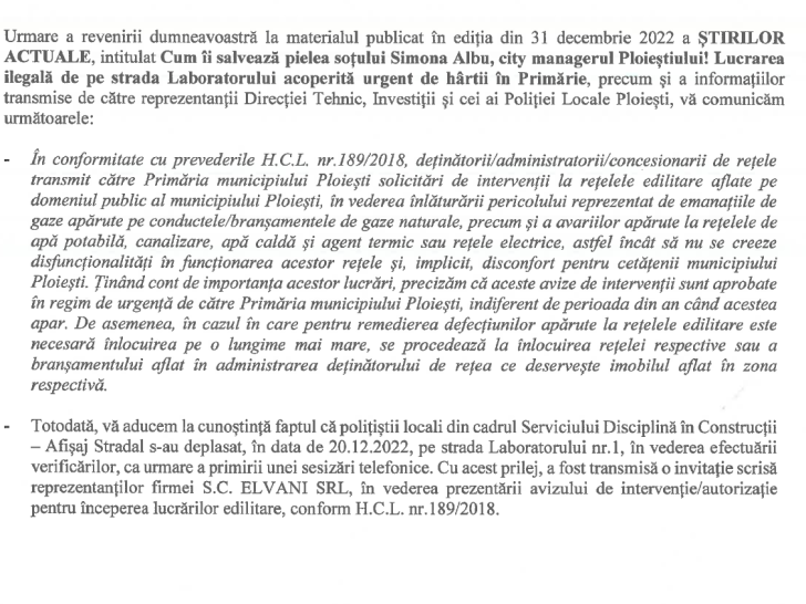 In loc să constate incălcarea hotărârilor de Consiliu Local privind interventiile pe domeniul public, reprezentanţii Primăriei Ploiesti au incercat să il protejeze pe Cătălin Albu, directorul Politiei Locale, si sot al Simonei Albu, city managerul orasului. Nu era mai simplu să fie luate măsurile pentru intrarea in legalitate? Nu e alta, dar minciuna are picioare scurte, iar documentele Primăriei nu sunt aceleasi cu cele de la Electrica.