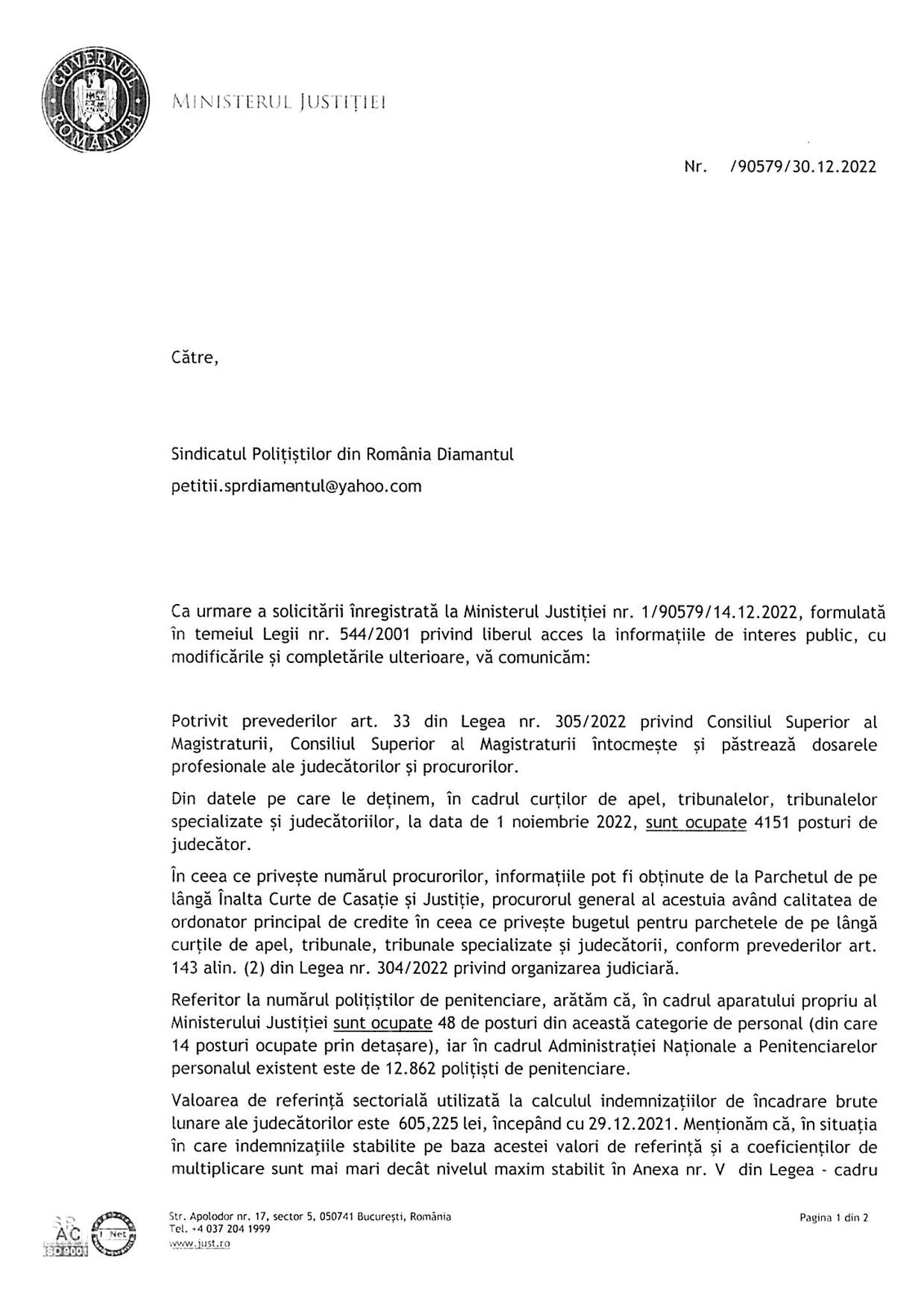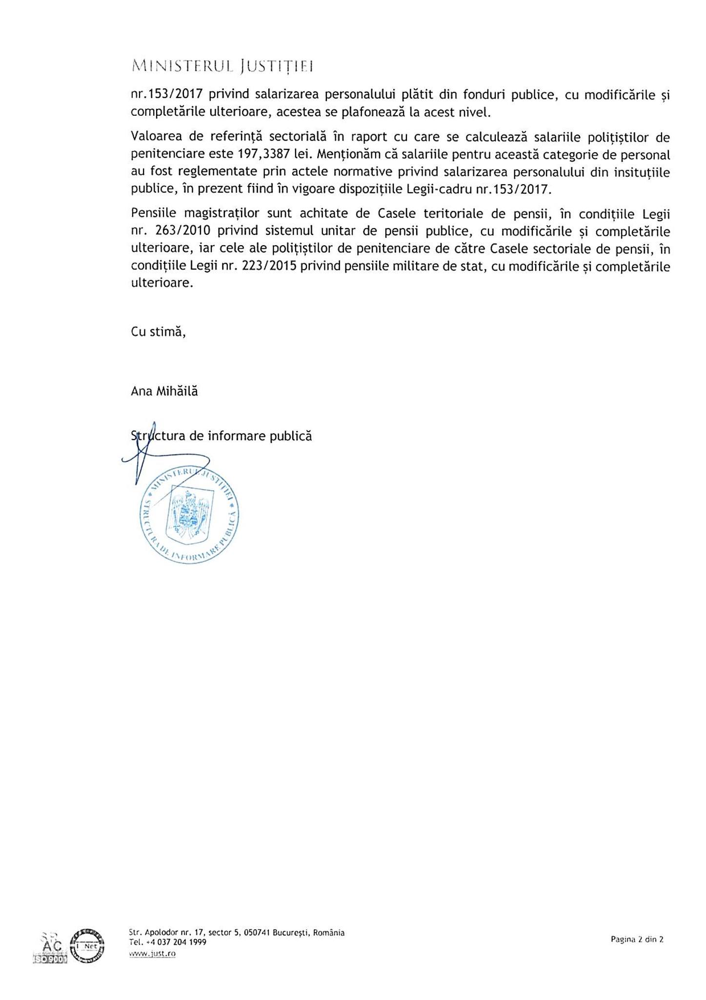 Valorile de referinta folosite la calculul salariilor pentru magistrati ( 605, 225 lei) si pentru politistii de penitenciare (197,33 lei)