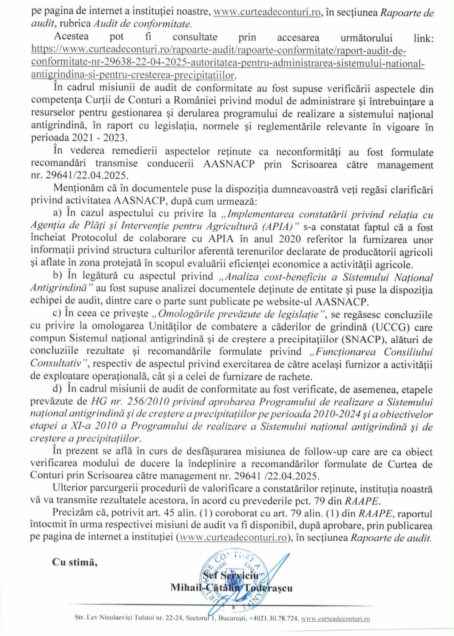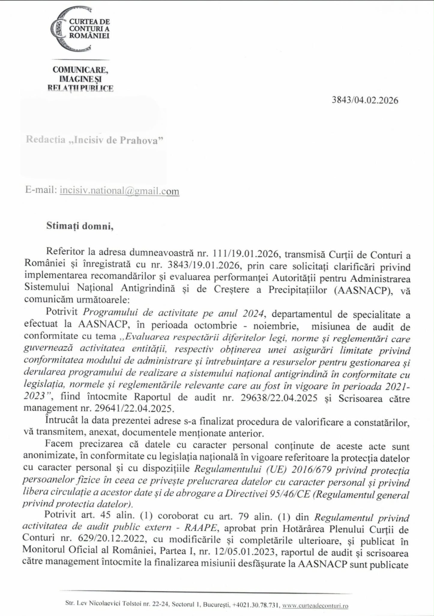 Curtea de Conturi a României, prin răspunsul oficial transmis ziarului de investigații „Incisiv de Prahova” (datată 04.02.2026), pune punctul pe „i” și pe „jaful-cu-aprobare”. Raportul de audit de conformitate (nr. 29638/22.04.2025) și Scrisoarea către management (nr. 29641/22.04.2025) demontează sistematic fiecare pretenție de eficiență sau legalitate a „scutului” antigrindină, confirmând, punct cu punct, fiecare dezvăluire a jurnaliștilor de investigații prahoveni. Cu alte cuvinte, pe ce au aruncat cu rachete, Curtea de Conturi a aruncat cu rapoarte! Și nu e ploaie, ci o avalanșă de ilegalități.