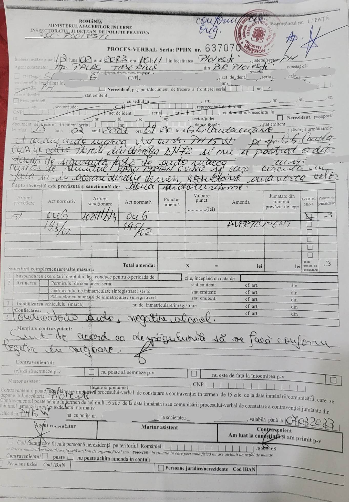 Umilirea si musamalizarea ordinara se poate vedea din avion, jurnalistul nostru realizand ca totul a fost o facatura ordinara in momentul in care, iesit cu scarba din aceasta institutie, a citit procesul-verbal seria PPHX 637070, prin care marele nostru si brav agent ca „organ” de nadejde ce face cinste IPJ-ului Prahova a specificat ca personajul care l-a accidentat pe reprezentantul nostru nu numai ca nu a ramas cu permisul suspendat, ci a primit doar AVERTISMENT si 3 puncte de penalizare. Deci, dragi interlopi, luati niste „janghine” de masini si treceti la accidentat incomozii! IPJ Prahova va protejeaza!