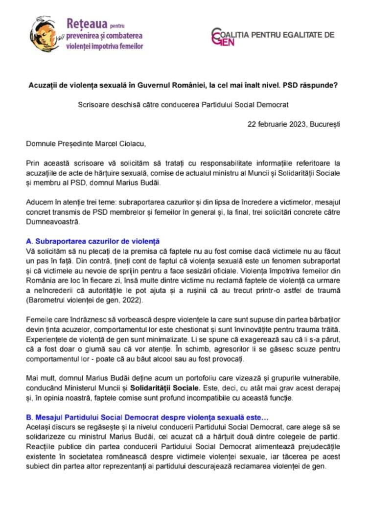 Prin această scrisoare vă solicităm să tratați cu responsabilitate informațiile referitoare la acuzațiile de acte de hărțuire sexuală, comise de actualul ministru al Muncii și Solidarității Sociale și membru al PSD, domnul Marius Budăi.