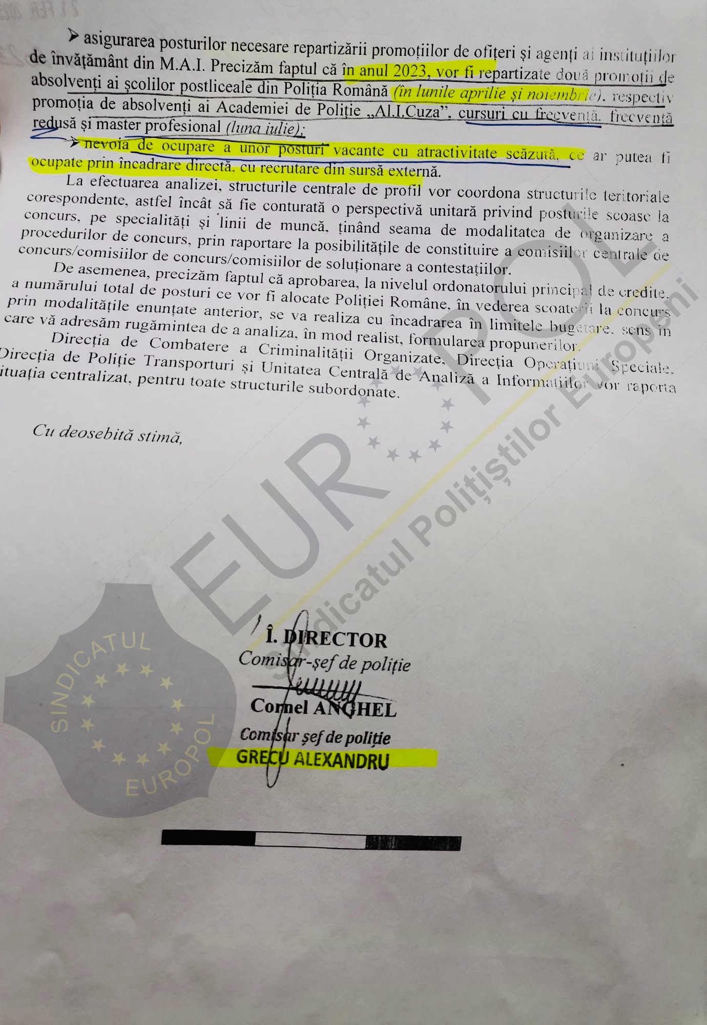 Conștienți și ei de dezastrul existent, în stilul caracteristic, în urma unei „Note de sarcini” cu S (secret de serviciu), pentru a nu putea avea acces la întreg conținutul, deși vorbim despre chestiuni ce vizează direct interesele profesionale, sociale și economice ale membrilor pe care îi reprezentăm, conform Legii 367/2022 privind Dialogul social, MAI a solicitat tuturor structurilor subordonate o situație a posturilor vacante, dar cu condiția „încadrării în limitele bugetare”. Cu alte cuvinte, în perioada imediat următoare se vor organiza concursuri de recrutare a polițiștilor din sursă externă, fără școală de poliție, însă nu în raport cu nevoia existentă ci în raport cu bugetul disponibil. În aceste condiții, putem trage concluzia că MAI și implicit Guvernul, nu este preocupat de siguranța cetățeanului, atâta vreme cât numărul locurilor scoase la concurs nu va ține cont de nevoile operative ci de câți bani are instituția pentru a plăti 100, 200 sau poate 500 de salarii în plus.