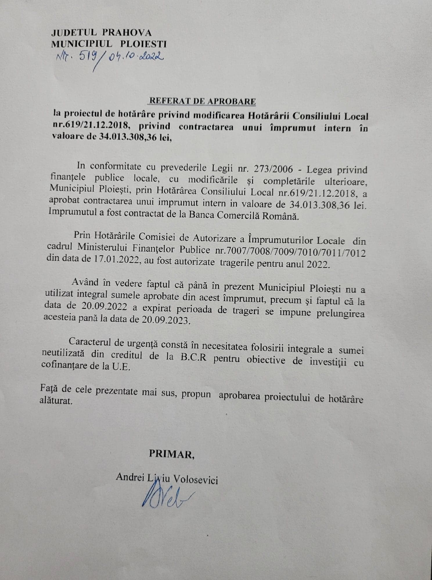 Desi directorul economic Nicoleta Craciunoiu a refuzat sa semneze o astfel de ilegalitate, cei sus mentionati la inceputul articolului au „pandit” cand acesta se afla in concediu si, la data de 04.10.2022, cu numarul 519, Andrei Volosevici intocmeste REFERATUL DE APROBARE la proiectul de hotarare privind modificarea Hotararii Consiliului Local nr 619/21.12.2018, privind contractarea unui imprumut intern in valoare de 34.013.308,36 lei.