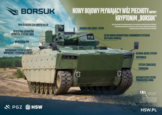 „Aprobarea contractului, a contractului cadru pentru comandarea a 1400 de vehicule de infanterie Borsuk pentru nevoile armatei poloneze a fost descrisă ca cel mai mare proiect al industriei de apărare poloneze din ultimii 50 de ani”, a spus Blaszczak, la semnarea contractului.
