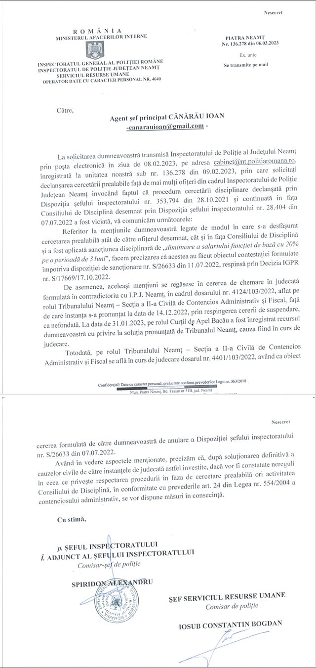 Dacă un polițist cercetat disciplinar atacă în instanță dispoziția prin care s-a declanșat cercetarea șeful inspectoratului este obligat s-o suspende până apare o hotărâre definitivă