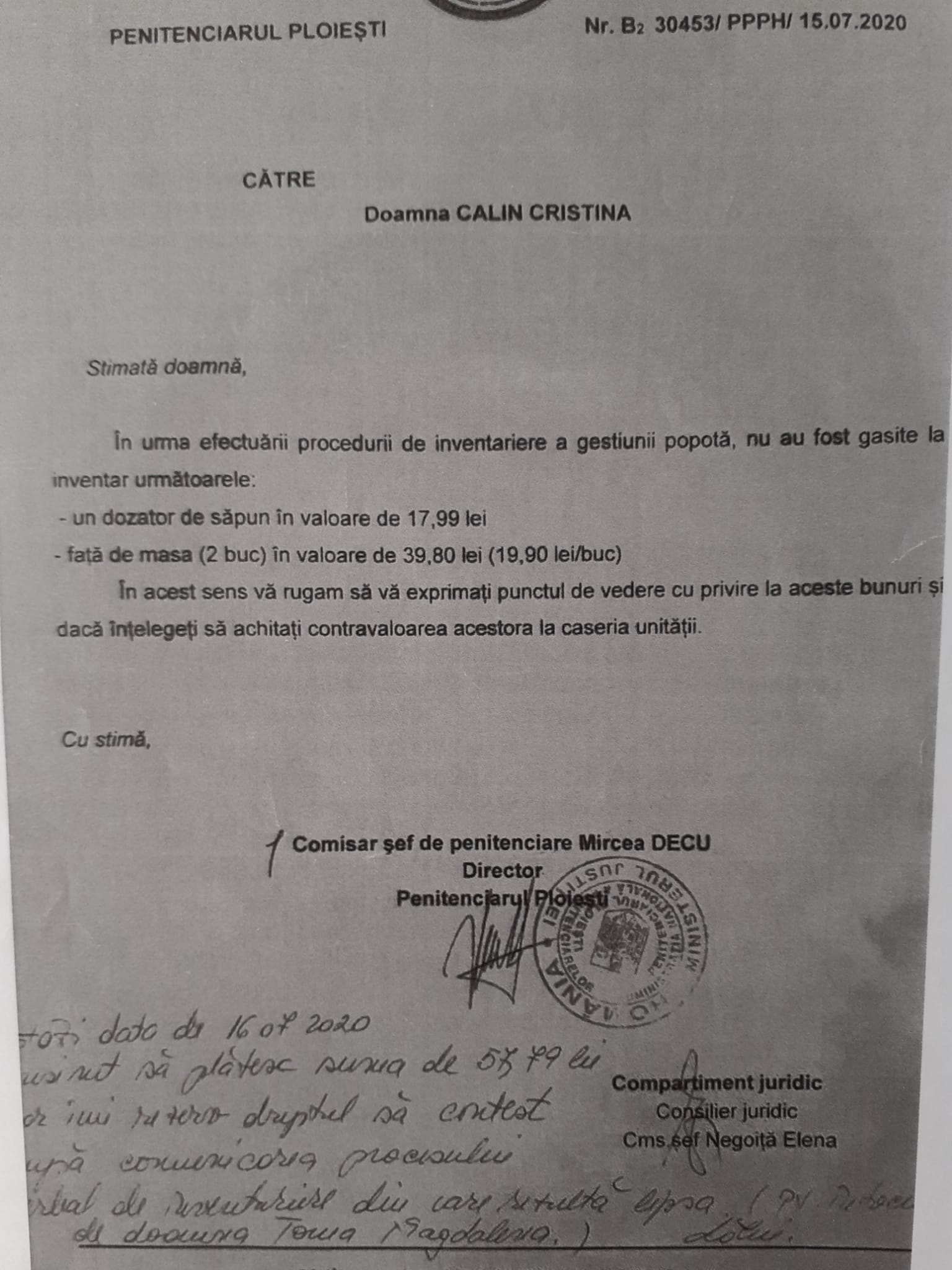 ,,Menționez că în luna mai 2019, primele bunuri materiale achiziționate din banii mei au fost 4 seturi tacâmuri a câte 24 piese fiecare și 30 farfurii, introduse în penitenciar cu acordul directorului.