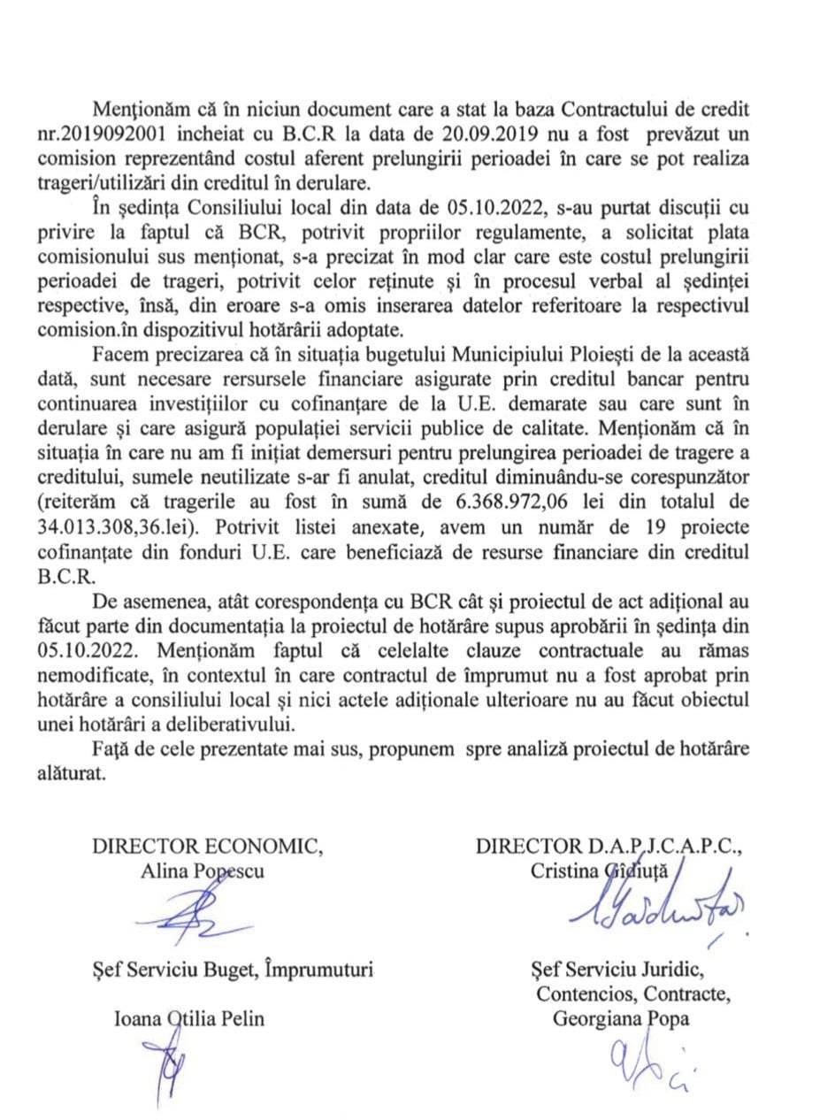 Primarul Andrei Volosevici semneaza, de capul sau, fara o Hotarare a Consiliului Local Ploiesti, un act aditional cu BCR, la data de 20.09.2022, pentru prelungirea perioadei de tragere pana la data de 20.09.2023.