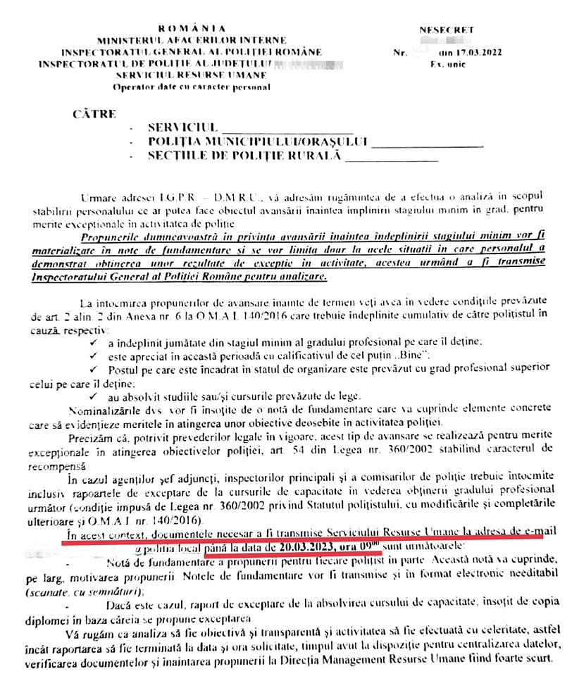1 oră au avut la dispoziție șefii să propună polițiștii care vor fi avansați înainte de termen