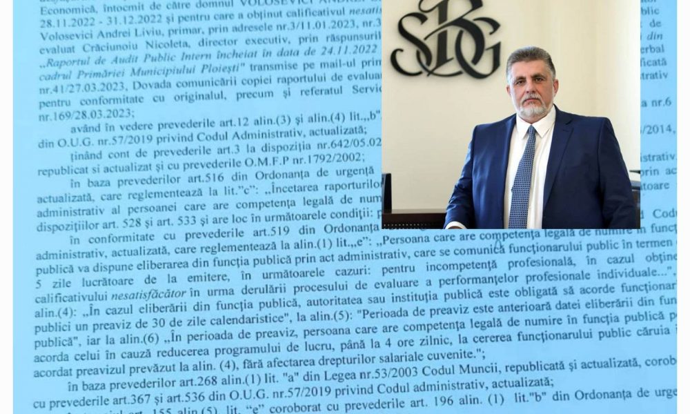 Renumitul avocat George Botez, consilier local, reactioneaza la infractiunea edilului de eliberare din functia publica a directorului de la Directia Economica, Nicoleta Craciunoiu Dupa o evaluare pe 11 luni de zile efectuata de viceprimar Popa, cu nota 4,90 (F Bine), edilul nostru trece Directia Economica in subordinea sa si pentru perioada 28.11.2022-31.12.2022, i-a acordat ILEGAL, … Continuă lectura „Primarie pe persoana fizica”…” Volosevici da din nou dovada ca prezenta sa in fruntea Ploiestiului este un accident al istoriei pe care il regreta chiar si cei mai devotati sustinatori ai sai”