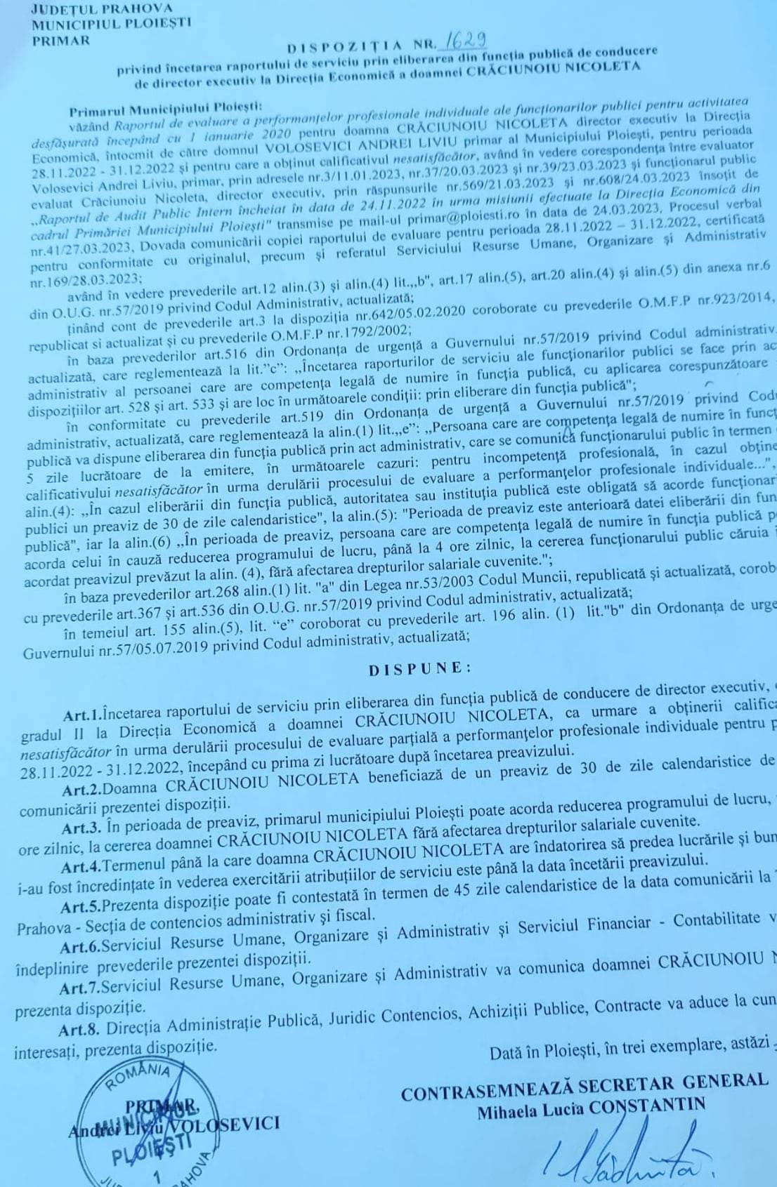 Ca sa vedeti „frumusetea” si „splendoarea” din „inteligenta” artificiala emanata de edil, va atasam ce a putut mentiona in dispozitia nr 1629 de ieri, edilul nostru care a dorit sa „scape” (ILEGAL!!!) de persoana care a asigurat legalitatea in primarie: