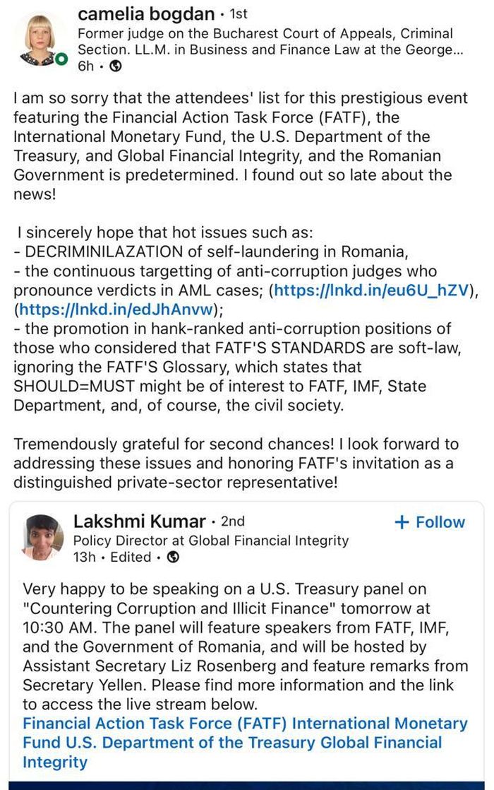 A anuntat pe o retea de socializare (facsimil) ca a primit sansa de a lucra in cadrul Grupului de Actiune Financiara (FATF) pentru controlul spalarii banilor, Grup infiintat la Summitul G7 de la Paris, in 1989, ca un organism inter-guvernamental menit sa stabileasca standardele internationale, sa dezvolte si sa promoveze politici de combatere a spalarii banilor si finantarii terorismului. Ei bine, Camelia Bogdan va fi „reprezentant distins al sectorului privat” in cadrul acestui Grup FATF, declarandu-se „foarte recunoscatore pentru a doua sansa”: „Foarte recunoascatoare pentru a doua sansa! Astept cu nerabdare sa abordez aceste probleme si sa onorez invitatia FATF in calitate de reprezentant distins al sectorului privat!”. Noi ii uram succes in cariera, avand convingerea ca se va descurca de minune acolo. (Irinel I.).