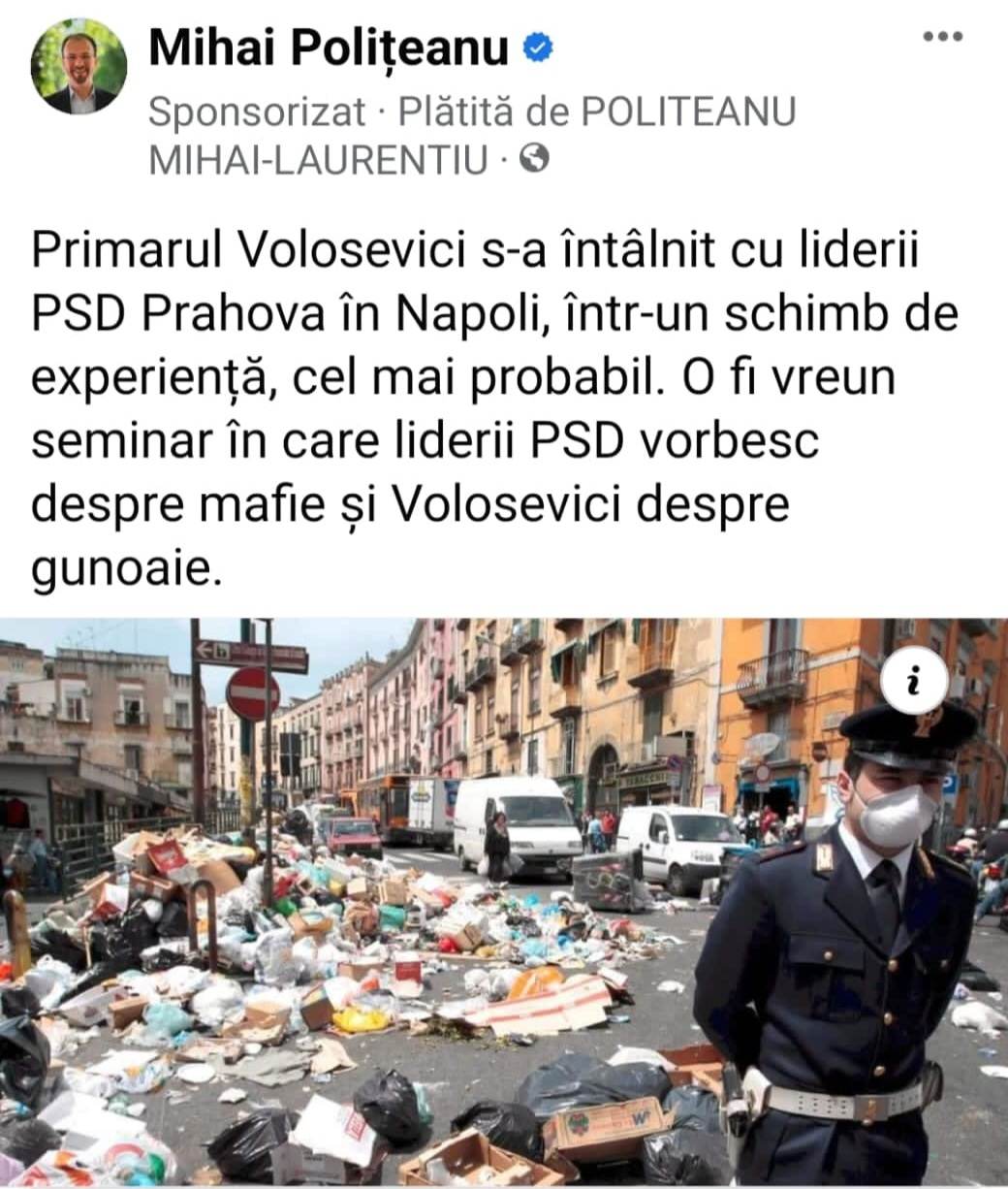 „Primarul Volosevici s-a intalnit cu liderii PSD Prahova in Napoli, intr-un schimb de experienta, cel mai probabil. O fi vreun seminar in care liderii PSD vorbesc despre mafie si Volosevici despre gunoaie”, a fost mesajul postat de deputat. (Redactia Incisiv de Prahova).