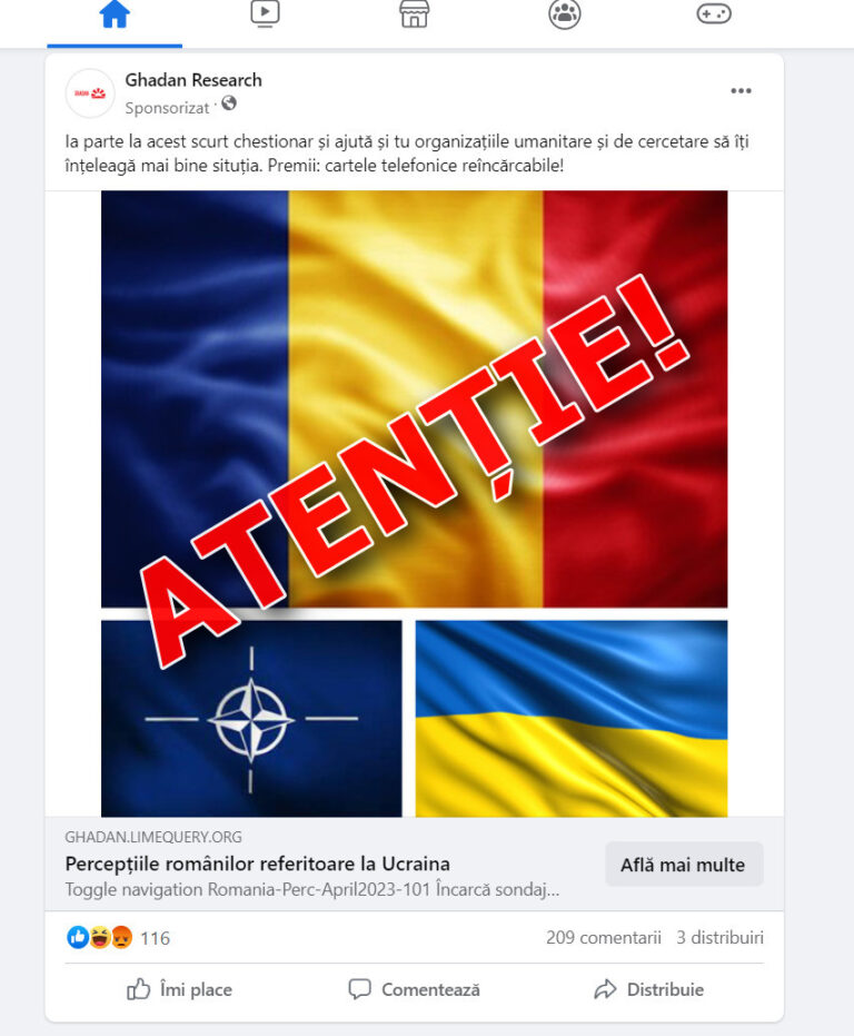 Facebook nu închide și nu limitează accesul unor asemenea pagini-paravan. Conform informațiilor publice oferite de rețeaua socială, pagina dată a rulat, în luna aprilie, opt postări sponsorizate cu acest chestionar, pe Facebook și Instagram. Ar trebui să fim vigilenți la promisiunile despre premii fictive și la sondajele false de opinie. Sondajele reale și transparente au autori identificabili.