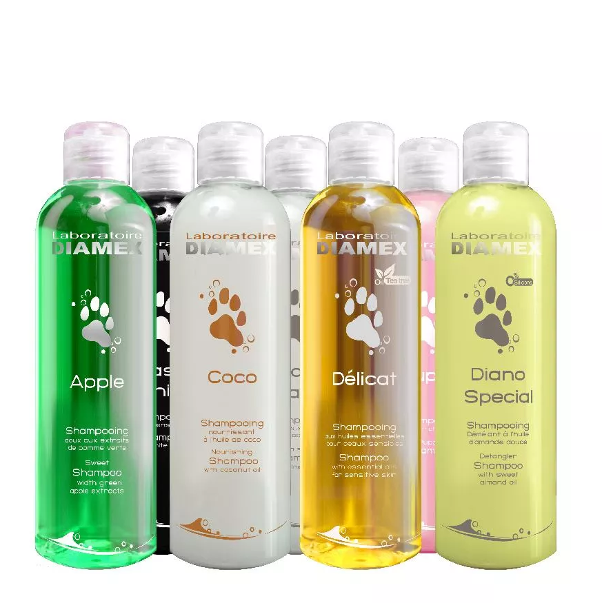 Diamex Laboratory este brandul numarul unu din Belgia specializat in produse cosmetice pentru animale adresat profesionistilor in ingrijire si toaletare. Cu o experienta de peste 60 de ani, laboratoarele Diamex se afla in slujba profesionistilor in ingrijire. Datorita formulei echilibrate si a valorii pH ajustate a sampoanelor, balsamurilor si produselor de ingrijire, acestea sunt perfect potrivite pentru caracteristicile specifice fiecarui tip de piele si blana. Sampoanele au rol de curatare iar balsamurile au rolul de a reface protectia blanii cainilor. Produsele de la Diamex sunt din gama sampoanelor, balsamuri, masti, sprayuri si parfumuri si se adreseaza diferitelor tipuri de blanuri, unele dintre acesta confera protectie impotriva insectelor, pot fi utilizate si pentru pui, contin minerale si uleiuri esentiale unele avand in componenta doar substante vegetale. Toate produsele Diamex Laboratory folosesc apa de osmoza pentru a preveni orice posibila reactie alergica.