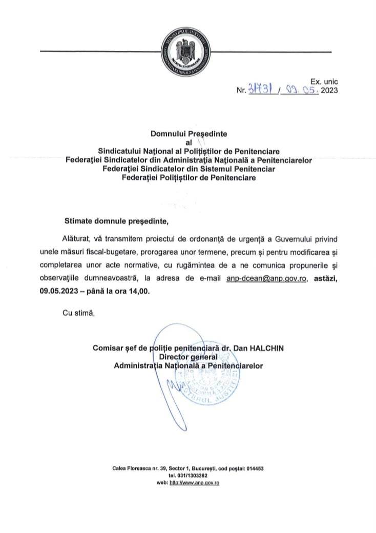 Administrația Națională a Penitenciarelor a solicitat ieri, ca o consultare fulger de doar câteva ore, puncte de vedere de la organizațiile sindicale cu privire la proiectul de ordonanță de urgență a Guvernului cu privire la unele măsuri financiar fiscale pentru anul 2023.