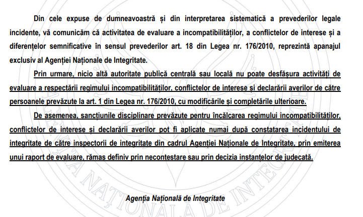Singura institutie competenta sa emita puncte de vedere referitor la incompatibilitati si conflicte de vedere este ANI, nu DGMRU!