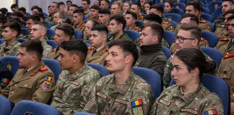 Imaginați-vă un amfiteatru sau o sală de curs într-o academie militară, unde omogenitatea ținutei militare românești este spartă de modele de camuflaj ale altor armate aliate și partenere. Toate sunt kaki și verzi, de forțe terestre, dar în nuanțe distincte. E foarte multă activitate.
