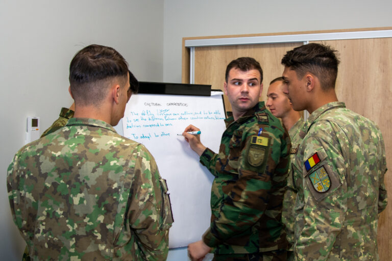 Locotenent-colonelul James Askew și maiorul Peter White, din cadrul Land Warfare Centre, International Defence Training din Marea Britanie, au pregătit studenții în ceea ce privește importanța înțelegerii particularităților culturale pentru îndeplinirea cu succes a misiunilor în diferite teatre de operații (Cultural awareness) și procesul de luare a deciziei în organizația militară (Combat estimate).