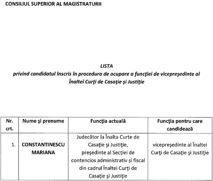 Judecatoarea suprema Mariana Constantinescu este singura care s-a inscris in procedura