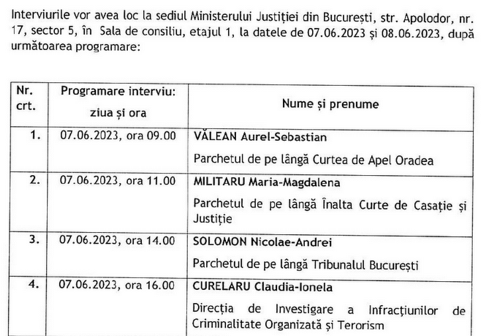 Joi, 8 iunie 2023, interviurile vor continua cu candidatii pentru cele doua posturi de adjunct DNA, pentru care s-au inscris procurorii DNA Tatiana Toader, Paul Silviu Dumitriu si Monica-Erika Danciu. (Irinel I.).