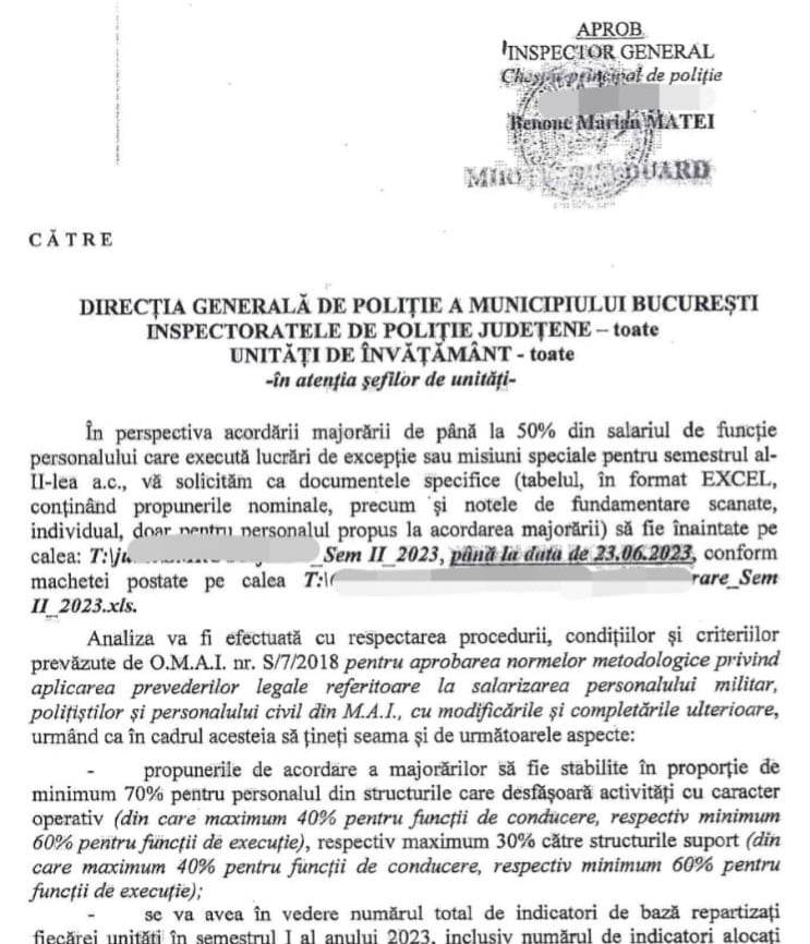 Ca în fiecare an, angajații Ministerului Afacerilor Interne, prin structurile subordonate, vor fi evaluați pentru ultimele 6 luni de zile de activitate în vederea acordării salariilor pentru lucrări de excepție. În acest sens, Direcția Resurse Umane din cadrul Inspectoratului General al Poliției Române, a transmis în data de 15.06.2023, pentru unitățile teritoriale, o circulară prin care reiterează normele de aplicare pentru acest drept, conform O.M.A.I. S/7/2018, privind condițiile de acordare a majorării de până la 50% din solda salariului funcției de bază/salariul de bază, dezvaluie cei de la sindicatul Sidepol.