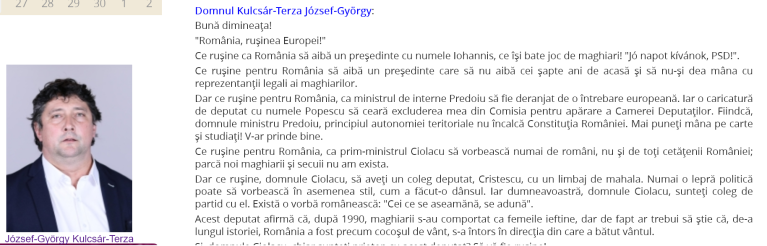 Deputatul UDMR Kulcsár Terza György face afirmații grave și insultătoare la adresa României, afirmînd, într-o declarație în parlament, că ”e rușinea Europei” care s-a întors mereu în funcție de cum a bătut vîntul și promițînd că într-o zi Dumnezeu va face dreptate maghiarilor pentru momentul 1918, cînd Transilvania a revenit la țara-mamă. Deputatul UDMR, care citează dintr-un poet ungur considerat de decenii criminal de război, atacă, de asemenea, cu vorbe grele, președintele, premierul, membri ai guvernului și ai parlamentului